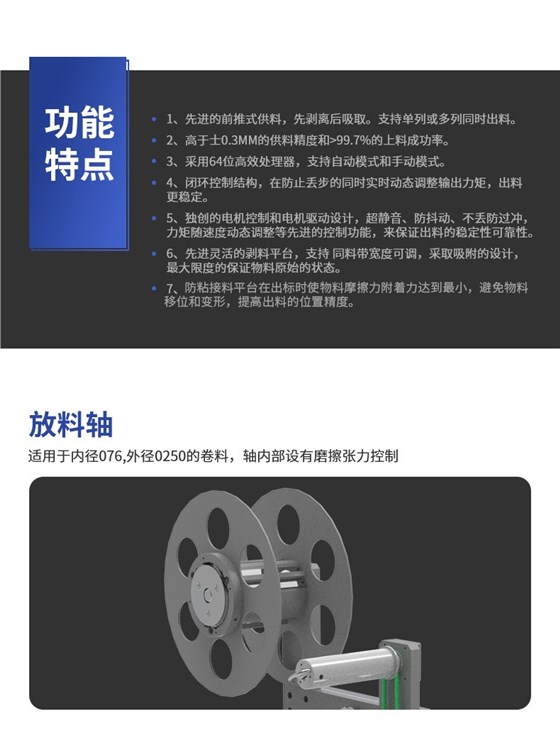 独创的电机控制和电机驱动设计,超静音、防抖动、不丢防过冲,力矩随速 度动态调整等先进的控制功能,来保证出料的稳定性可靠性。先进灵活的剥料平台,支持 同料带宽度可调,采取吸附的设计,最大限度的 保证物料原始的状态。
